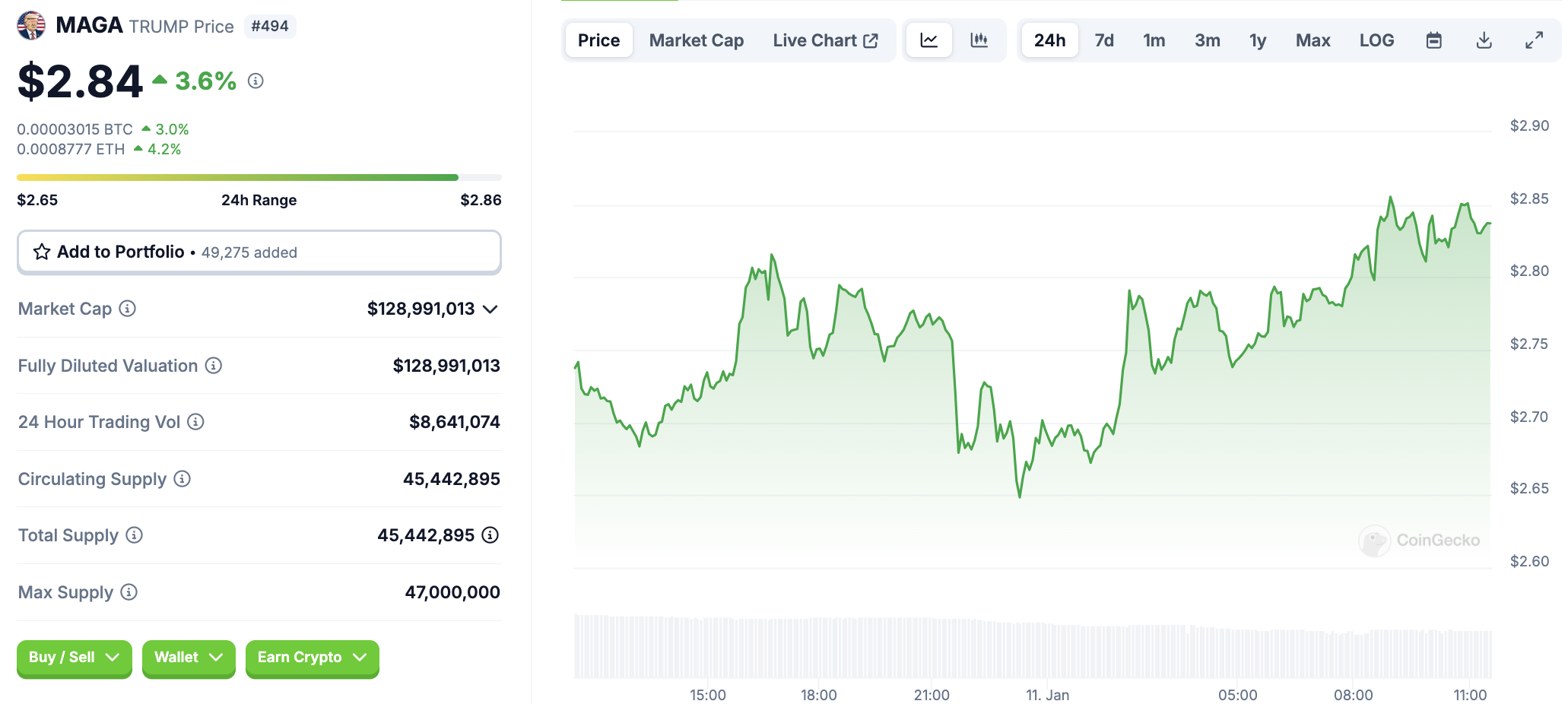 或受川普無條件釋放影響,川普相關迷因幣有所反彈。CoinGecko 數據顯示,市值最高的 TRUMP 幣價現報 2.84 美元,近 24 小時上漲 3.6%、近 7 天上漲 72.5%,市值達 1.28 億美元;市值次高的 MAGA 則上漲 2.4%,幣價現報 0.00008991 美元。