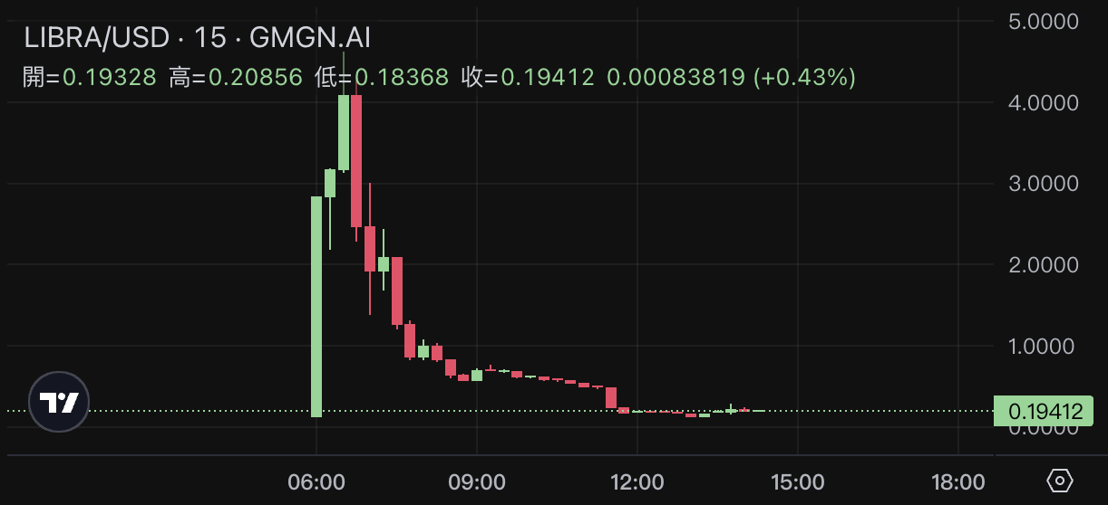 然而,隨著 Javier Milei 刪推,$LIBRA 15 分鐘內暴跌 50%,目前價格暫報 0.1941 美元,較高點回落超過 95.8%。